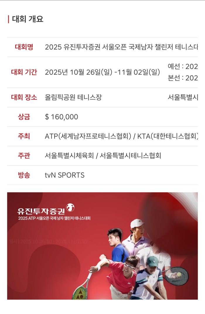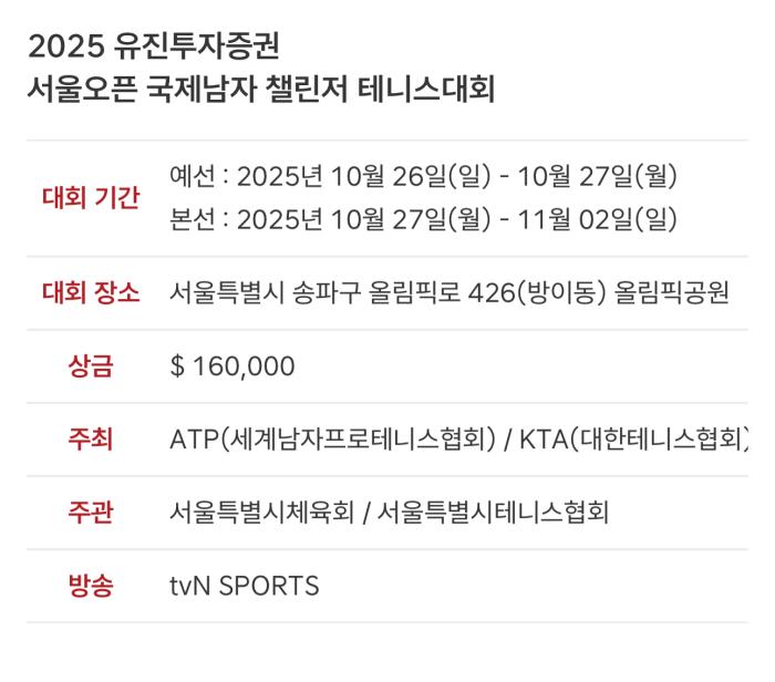 오는 10월 26일(일)부터 11월 2일(일)까지 유진투자증권 2025 ATP 서울오픈 국제남자챌린저테니스대회(이하 서울오픈)가 서울 올림픽공원 테니스코트에서 진행된다.