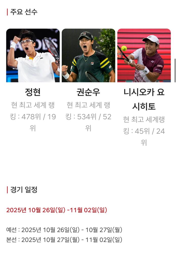 ATP(세계남자프로테니스협회)와 KTA(대한테니스협회) 주최, 서울특별시체육회와 서울특별시테니스협회의 주관으로 진행되는 2025 ATP 서울오픈은 우리나라의 국가대표인 정현과 권순우는 물론 호주의 크리스토퍼 오코넬(104위)과 제임스 덕워스(111위) 등 챌린저 대회 출전할 수 있는 레벨 중 톱 클라스 선수들이 출전한다.