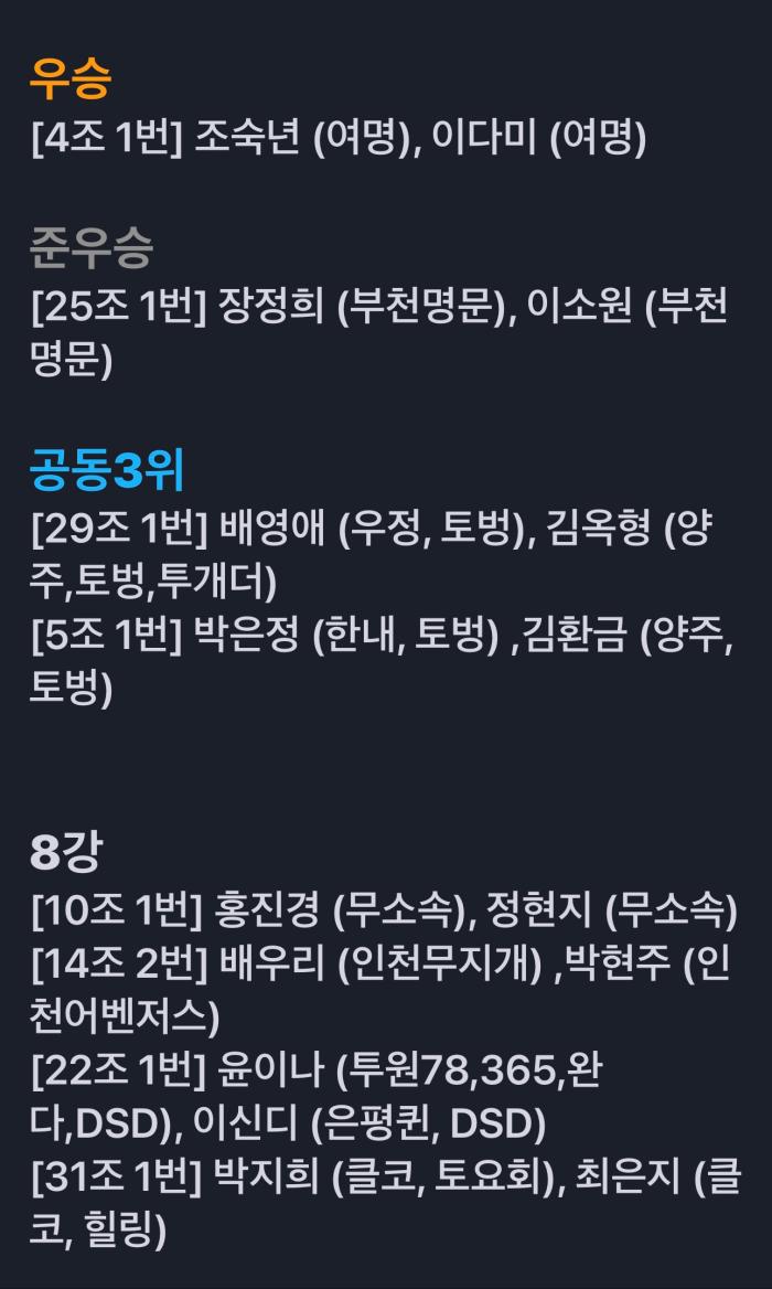 이번 전국 개나리부 대회는 총 100여팀이 참가했고, 조숙년(여명), 이다미(여명) 페어가 우승을 차지했다.
