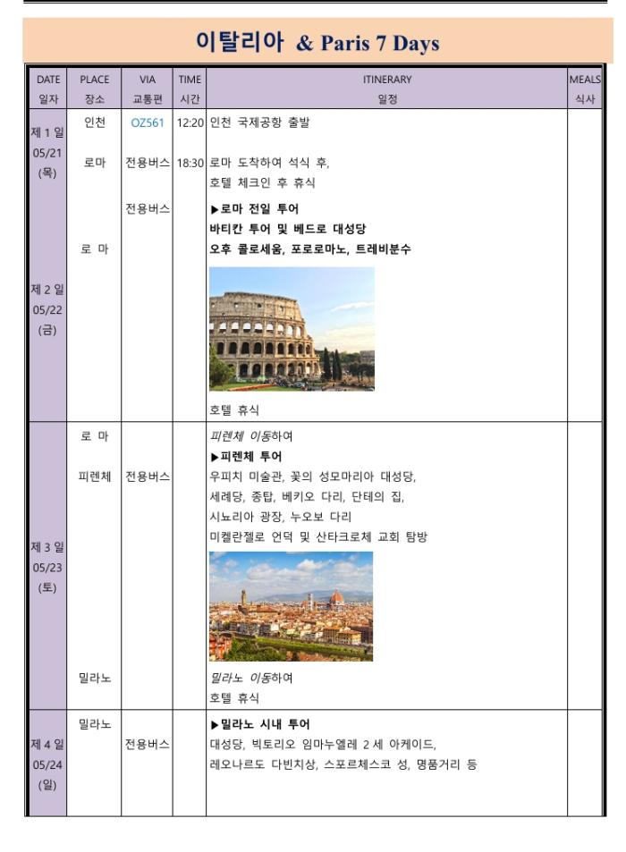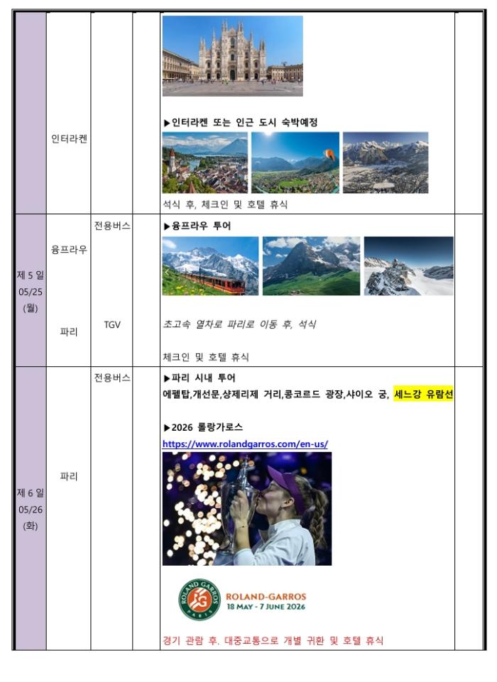 이탈리아, 로마, 스위스 융프라우를 거쳐 파리 입성, 그리고 에펠탑의 낭만을 보고 롤랑가로스 경기를 관전하는 그랜드슬램 투어 입니다. 붉은 앙투카에 슬라이딩 하는 선수들을 보는 그 느낌은 평생 잊지 못할 추억을 남겨 줄 겁니다.