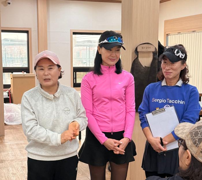 2026년 잔디를 이끌 김진숙 회장이 신임 임원진을 소개하고 있다 위 최정숙 부회장 아래 하미란 총무 김문자 경기이사