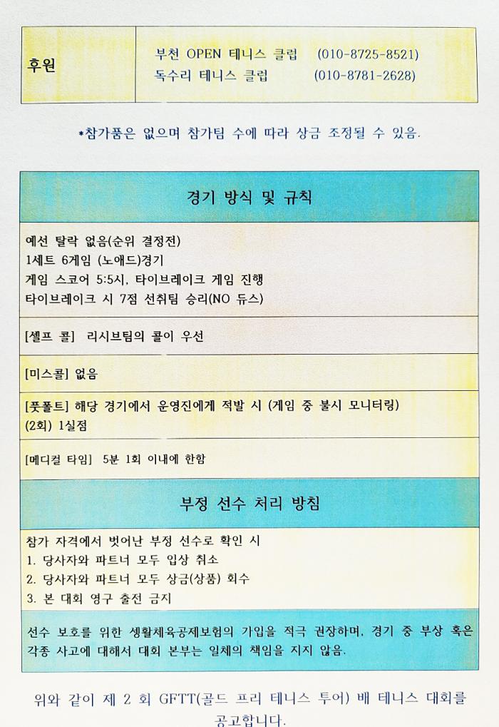 •  2026년 순금 미니골드바를 주는 대회인 GFTT(골드 프리 테니스 투어) 대회가 열립니다. 개나리부 복식으로 32팀 입니다.