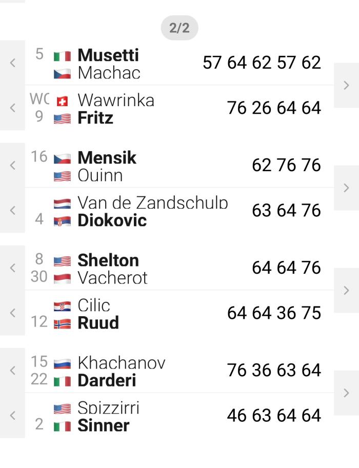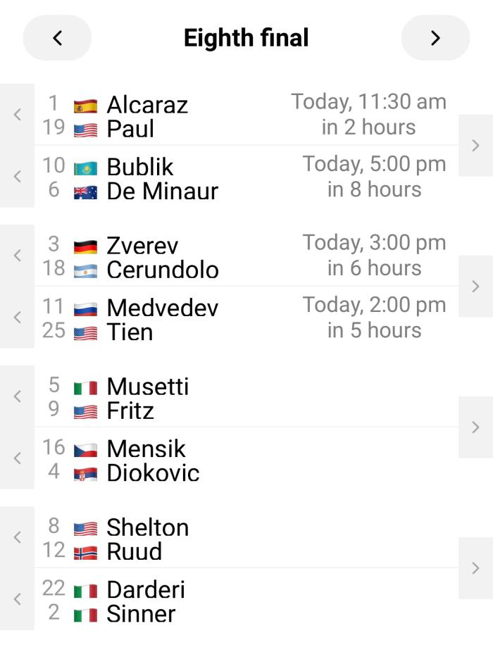▷ 최장 시간 • 로렌초 무세티: 10시간 23분, 16강 진출자 중 가장 많은 체력을 소모했다. 특히 토마시 마하츠와의 접전이 큰 부담으로 작용했다. 그 뒤를 이어 다닐 메드베데프가 9시간 37분을 기록했다. 메드베데프의 다음 상대는 리너 티엔으로 두 선수의 경기 역시 과거의 전례를 봤을 때 꽤 길어질 것으로 보인다.