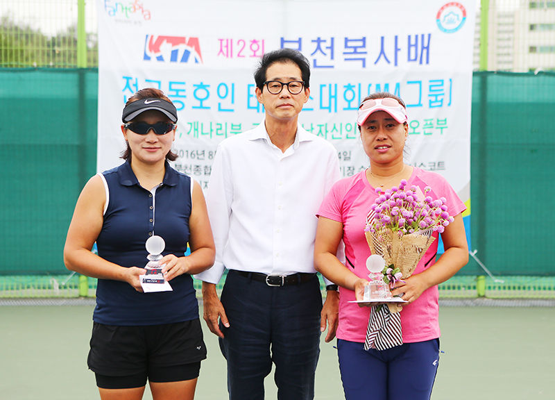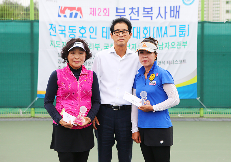 개나리부 우승을 차지한 황명임, 김미희 조와 준우승조 허영희, 김신자 조(좌로부터). 가운데는 정중렬 감독관