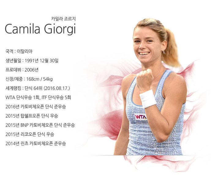 세계랭킹 77위의 카밀라 조르지는 2014년부터 이탈리아의 국가대표로 2014~16년 페드컵에 출전했으며 2015년에 랭킹 30위까지 올랐었다. 조르지는 2015년 스헤르토헨보스(‘s-Hertogenbosch.네덜란드)에서 우승하며 투어 타이틀을 하나 보유하고 있고, 지금까지 4차례나 결승에 올랐다. 아버지가 코치를 맡고 있다.