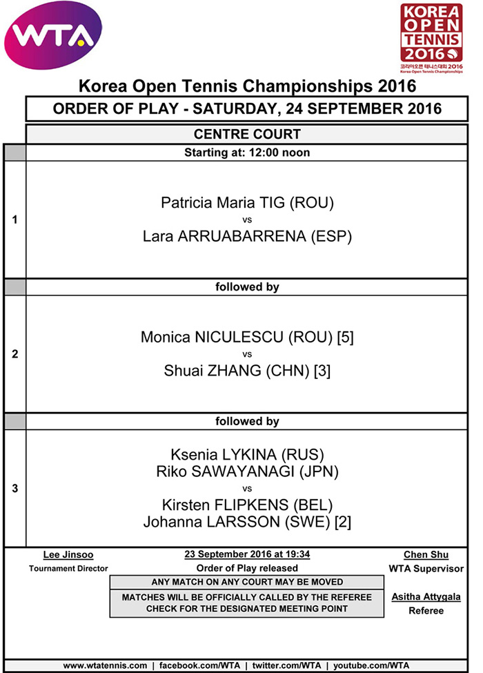 올해로 13회째 맞이한 코리아오픈이 이제 준결승과 결승만 남았다. 단식 8강전이 열린 23일, 4강에 오른 선수는 패트리시아 마리아 티그(루마니아)와 라라 아루아바레나(스페인), 그리고 모니카 니쿨레스쿠(루마니아)와 장수아이(중국)다.