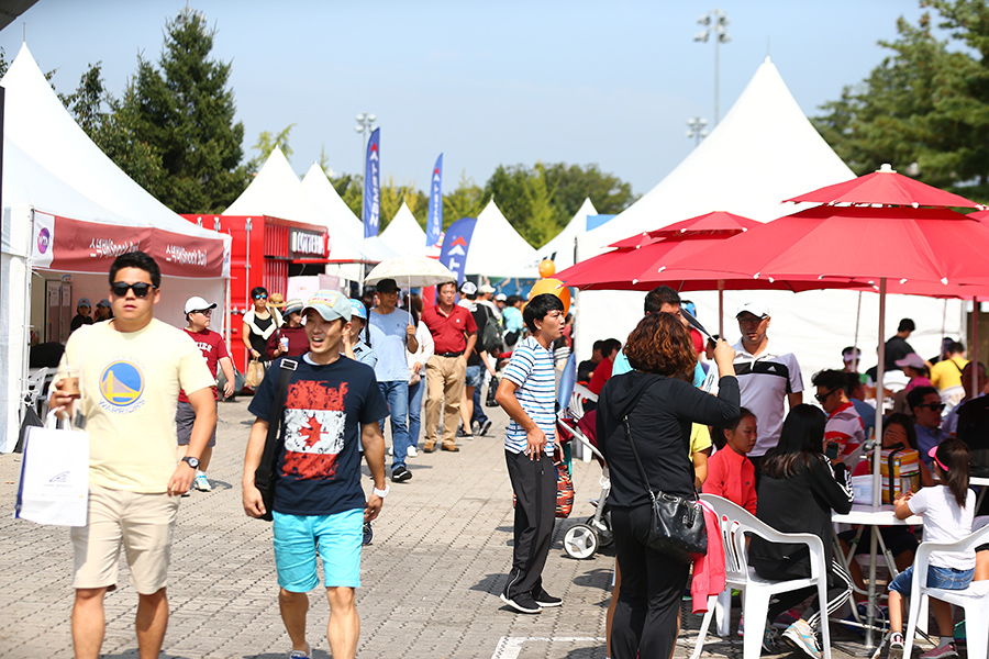 코트 옆에 설치되어 있는 부스에서 쇼핑을 하고, 파라솔에서 간식을 먹고 있는 관중들.