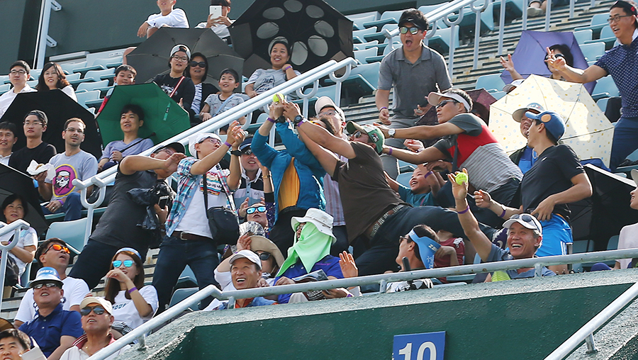 선수들의 사인볼을 받기 위해 손을 뻗고 있는 관중들.