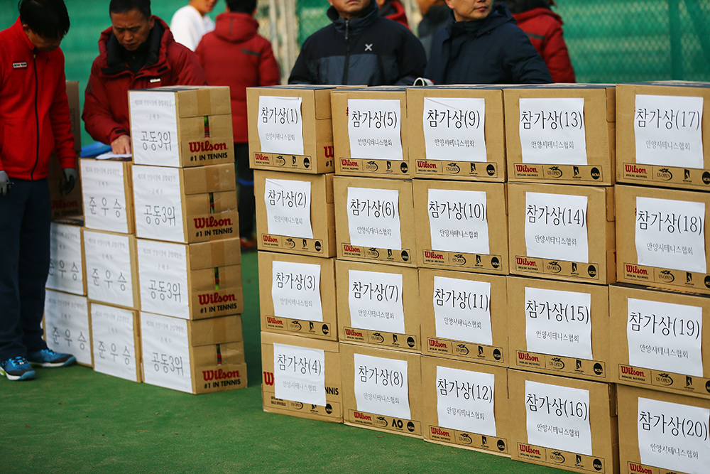 안양시 테니스 테니스 협회가 준비한 선수들 후원물품과 참가 기념품. 이 외에 협회장이 취임 기념 타올도 준비했다.