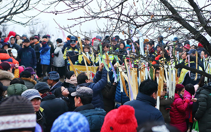 | 새해 소망을 적은 소망 리본과 일출을 보기위한 인파 |