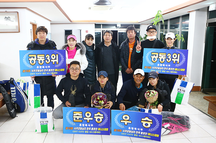 서귀포칠십리배 대회 본부 임원 및 혼합 복식 입상자들