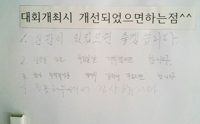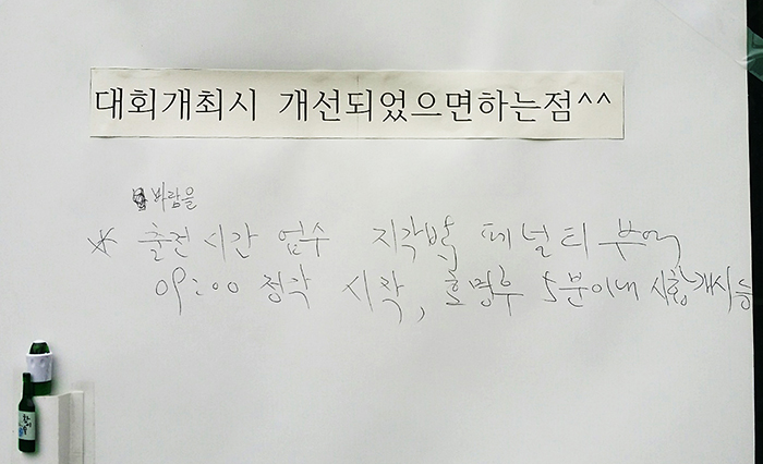 CH배는 대회가 진행된 각 코트마다 대회에 대한 개선점에 대해 설문을 붙였다. 참가자가 설문에 답했다.