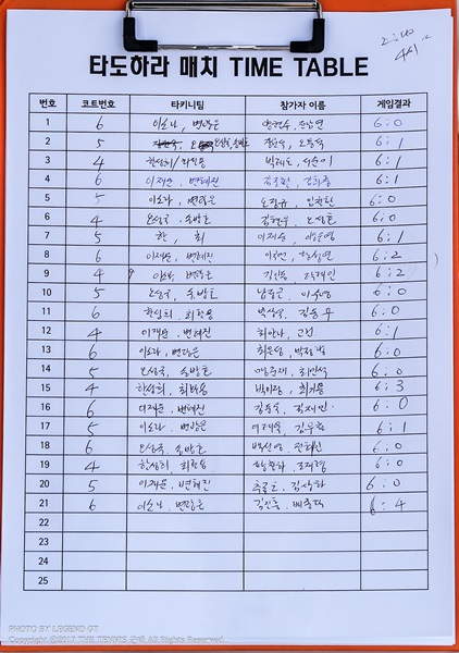 물론, 초보 실력의 도전 팀에게는 재미를 위해서 맞춰주기도 했지만, 게임 결과지에서 보여주듯 21 : 0 으로 동호인팀의 완패였다. 타키니팀은 모든샷을 기본에 충실한 완벽한 샷을 구사했다. 참가한 동호인들이 충분히 감사할만 했다.