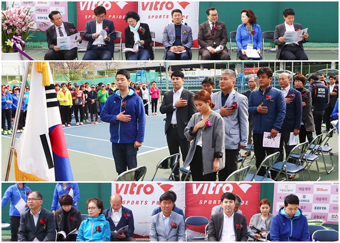 비트로배 제42회 전국화곡어머니테니스대회가 이틀간 열렸다. 참가 내외빈과 개회식의 국민의례.