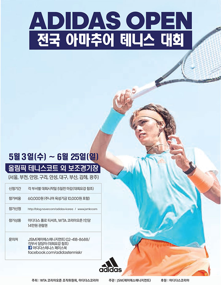 국내 최대 규모의 동호인 대회인 2017 아디다스 오픈 전국 아마추어 테니스 대회(대회장 이진수, 이하 아디다스오픈)가 시작됐다. 해마다 1천2백여팀이 참가하며 동호인 대회의 질을 높여왔던 아디다스오픈은 서울을 비롯 전국의 9개 도시에서 총 7개 부서로 개최된다.