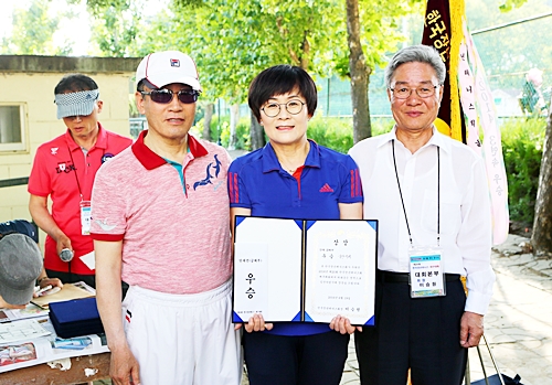 그들이 매만지는 공은 구리 빛 얼굴과 엷게 패인 미소(微笑)주름의 흔적만큼 구력의 기교가 그대로 묻어났다. 때로는 깃털을 다루듯 가볍게, 때로는 달궈진 쇠를 망치질 하듯 무겁게 황토 빛 코트 위에서 볼을 어루만졌다. 가장 정교하게, 가장 적절하게 볼을 보내고 코트를 활용한 팀은 울산지회였다. 장년대회의 최대 하일라이트는 배부 결승전에서 서울과 맞붙은 울산팀의 여자복식조다. 2승2패에서 마지막 1승으로 서울을 누르고 우승을 차지하며 5연패의 위업을 달성했다.