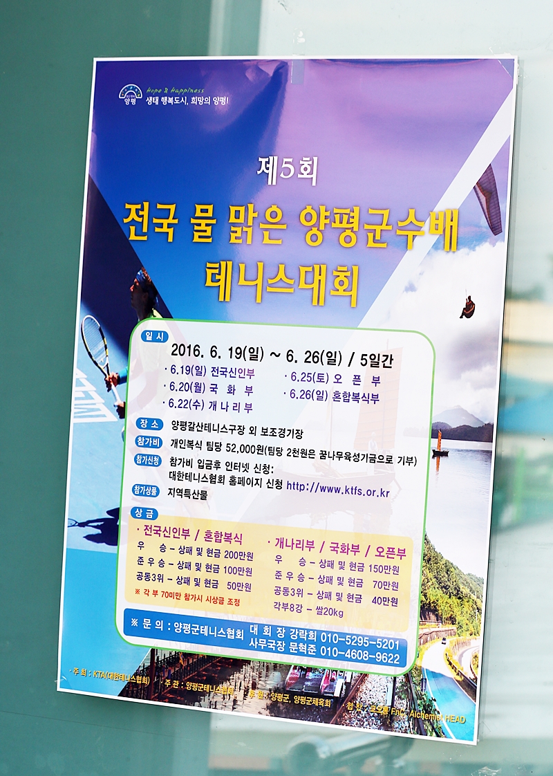6월19일(일) 전국신인부로 시작한 물 맑은 양평군수배는 20일(월) 국화부, 22일(수) 개나리부, 25일 남자오픈부(토), 26일(일) 혼합복식부로 진행됐다. 양평군은 처음에 월요일에 개나리, 화요일에 국화부 시합을 잡았다. 그러나 (사)한국테니스발전협의회(이하 카토)의 JDX 멀티 스포츠배 전국 동호인 테니스대회가 새로 생기면서 개나리부와 국화부의 일정이 겹쳤다.