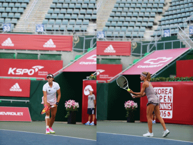한나래와 조르지의 서비스를 사진으로 비교해 본다. 한나래는 왼손잡이, 조르지는 오른손잡이다. 한나래는 플랫 폼(처음 준비 자리에서 두 다리를 움직이지 않고 서비스를 넣는 것), 조르지는 핀 포인트(처음 준비 자세에서 뒷 다리를 앞 다리 위치로 옮기며 서비스를 넣는 것)형의 서비스를 넣는다