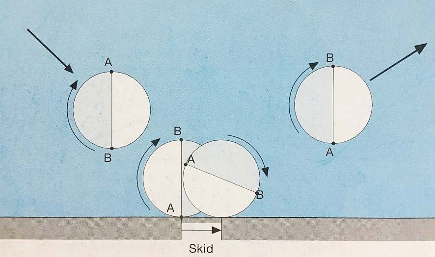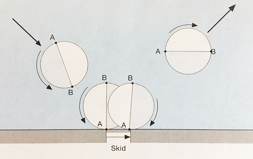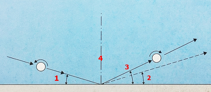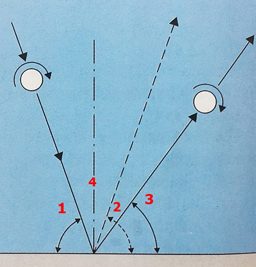 볼과 바운스에 대한 지난 기사(1월23일자)에서는 코트 종류에 따른 바운스의 변화가 어떻게 일어나는 지에 대해 설명했습니다 이번 시간에는 볼의 종류에 따른 바운스에 대해 설명합니다.1. 볼이 바닥에서 튀어 오를 때 나타나는 현상볼이 코트 바닥에 맞고 튀어 오를 때 코트와 볼의 마찰력에 의해 다음과 같은 3가지 현상이 연속적으로 일어난다.회전이 없는 볼의 바운스. 입사각과 반사각이 같다. 볼이 코트 바닥에 접촉되면서 스키드가 일어난다.(1) 볼이 코트 바닥에서 스키드(미끌어짐) 된다..(2) 날아온 볼에 상관