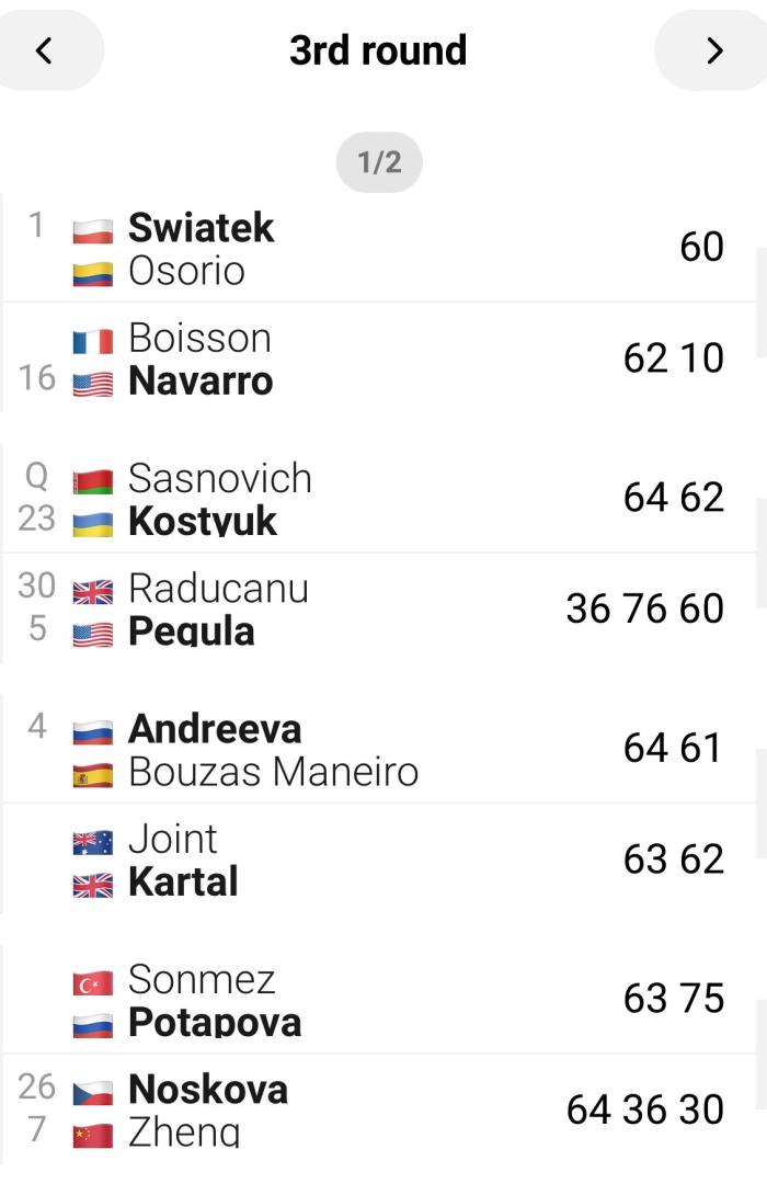 WTA1000 차이나 오픈에 출전한 톱 플레이어들은 비교적 순항중이다. 1번 시드 시비옹테크를 비롯 2~6번 시드 모두 4라운드에 올랐다.