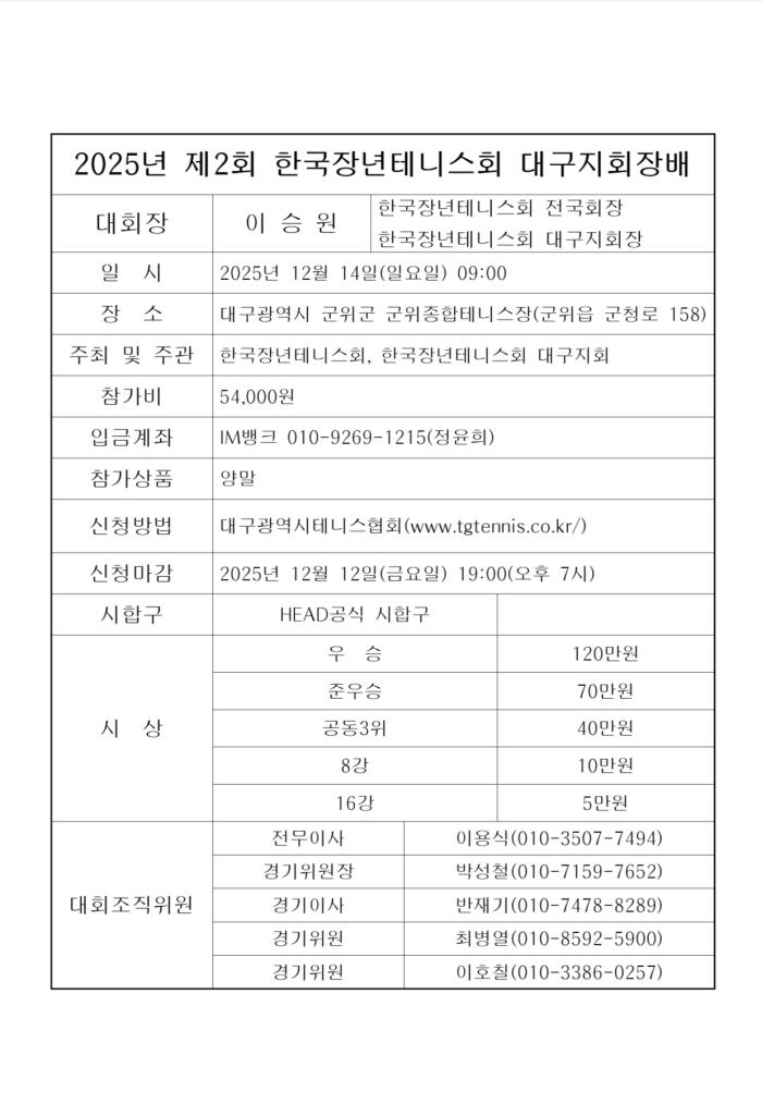 한국 장년테니스회 대구지회에서 대구지회장배(대회장 이승원)를 오는 12월 14일 군위종합테니스장에서 개최한다.