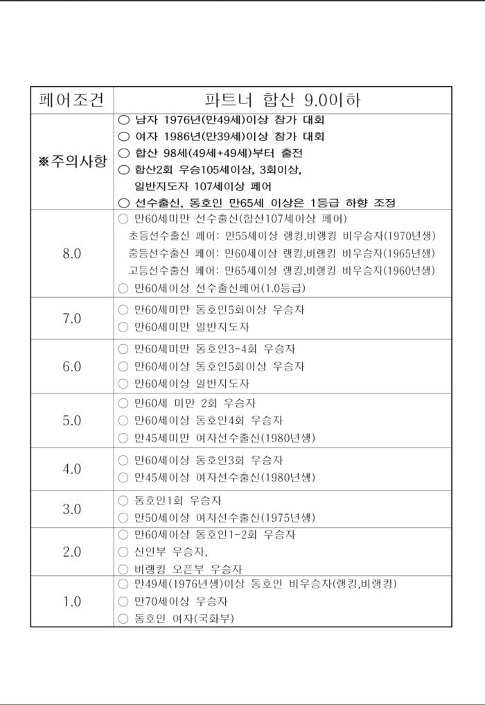 참가 자격은 남자 만 49세 이상, 여자 만 39세 이상으로 합산 페어 9점 이하 대회다.