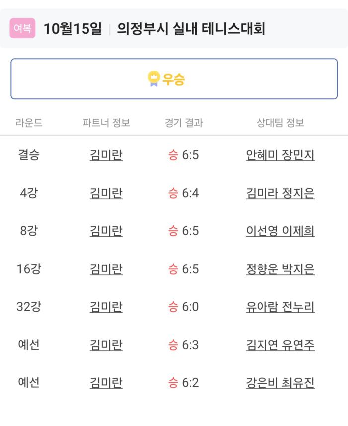 ![]() 지난 10월 15일 의정부시 호원 실내 테니스장에서 의정부시테니스협회 주최 의정부시 실내 테니스대회 개나리부 대회가 있었다. 결승에서 김영란(퇴계원클럽)·김미란(퇴계원) 페어와 안혜미(철원와수)·장민지(철원와수) 페어가 만나 란2(김영란·김미란) 페어가 2대 5에서 대 역전극을 펼치며 우승을 차지했다.
