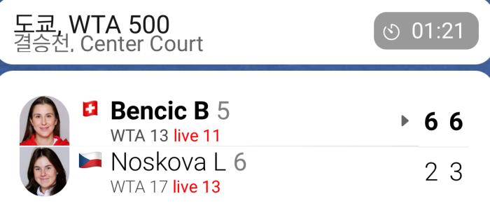한편, 일본 도쿄에서 열린 토레이 팬 퍼시픽 WTA500대회에서는 캐나다의 벨린다 벤치치(28세, 13위)가 체크 공화국의 린다 노스코바(20세, 17위)를 세트 스코어 2-0으로 누르고 챔피언이 됐다. 벤치치는 소피아 케닌을 상대로 2-1승을, 노스코바는 리바키나에게 기권승을 거두고 결승에 올랐었다.