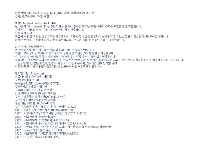 한미영 작가의 〈빛을 담다〉는 동양화와 서양화의 경계를 허무는 퓨전 예술의 새로운 도전을 담은 작품입니다. 작가는 이 작품을 통해 자유와 희망의 메시지를 전달합니다.