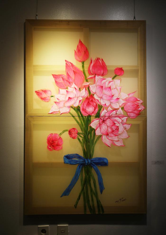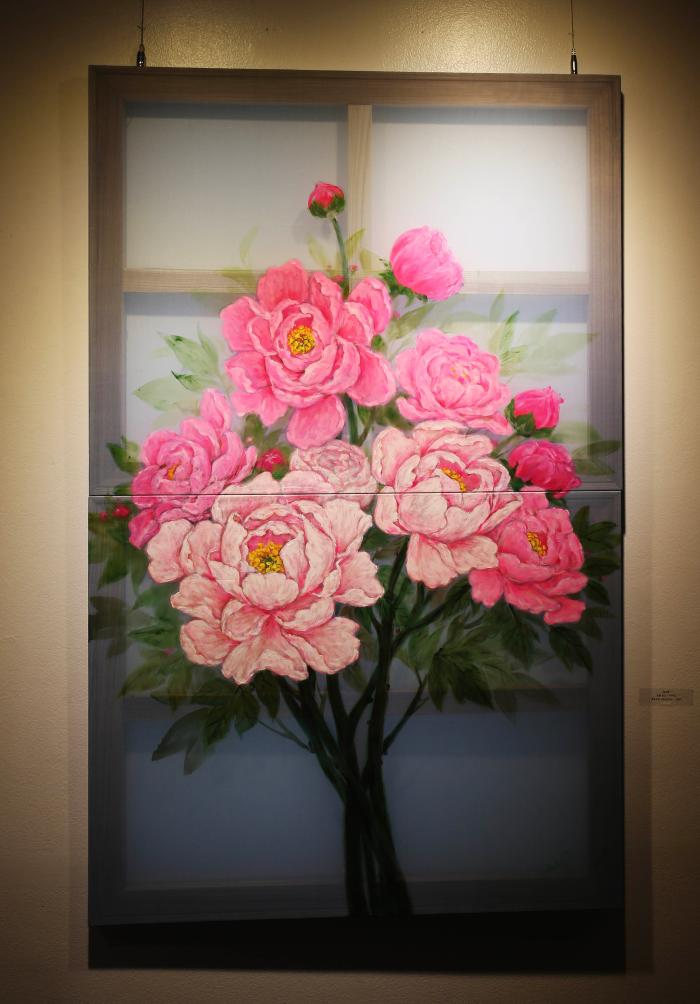 이번 전시는 동문전이면서 동시에 3인전이다. 한미영 작가는 ‘3way’라는 제목에 대해 “같지만 다른 세 개의 길”이라고 설명한다.“선, 여백, 색채를 바라보는 시선이 각자 달라요. 30년 넘게 서로 다른 길을 걸어왔는데, 지금에서야 동문으로 다시 만나게 됐다는 의미입니다.”꽃, 생명력과 이상향을 그리다이번 전시에서 한미영의 작품을 관통하는 소재는 꽃이다. 그는 꽃을 단순한 장식적 대상으로 보지 않는다.“꽃은 아름답다는 의미를 넘어서 생명력 그 자체라고 생각해요. 각각의 꽃말 안에는 사람들이 바라는 이상적인 삶의 모습이 담겨 있잖아요.”작품의 중심에는 모란과 연꽃이 자리한다. 모란은 조선시대 이전부터 왕실 병풍에 등장해 온 꽃으로, 부귀와 번영을 상징한다. 연꽃 역시 자손 번창, 학문적 성취 등 긍정적 의미를 지닌다.“자본주의 이전부터 사람들은 잘 사는 걸 꿈꿔왔어요. 그런 바람이 생활 속 작품으로 들어가길 바랐습니다.”
