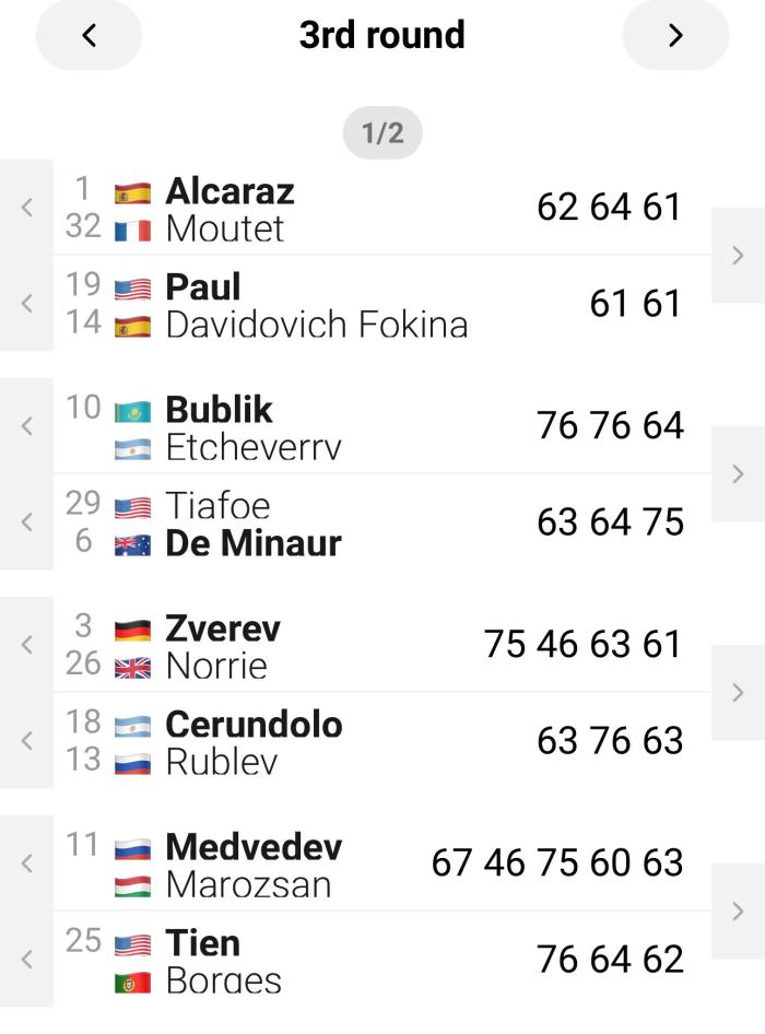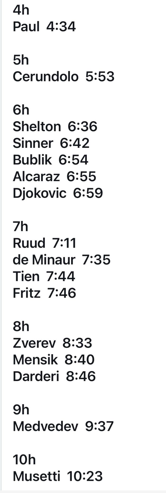▷ 최장 시간 • 로렌초 무세티: 10시간 23분, 16강 진출자 중 가장 많은 체력을 소모했다. 특히 토마시 마하츠와의 접전이 큰 부담으로 작용했다. 그 뒤를 이어 다닐 메드베데프가 9시간 37분을 기록했다. 메드베데프의 다음 상대는 리너 티엔으로 두 선수의 경기 역시 과거의 전례를 봤을 때 꽤 길어질 것으로 보인다.