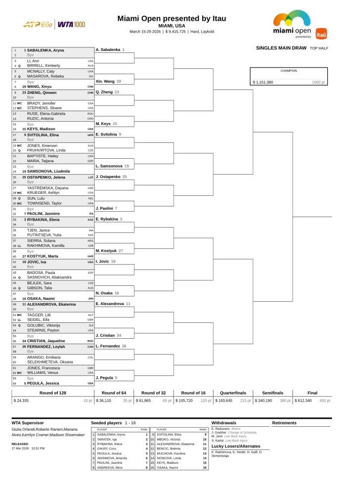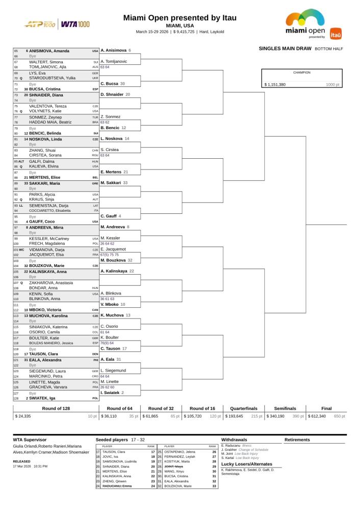 인디언웰스와 함께 ‘선샤인 더블(Sunshine Double)’을 이루는 핵심 대회로, 그랜드슬램 다음 단계의 위상을 지니며 매년 세계 정상급 선수들이 총출동하는 무대다. 대회는 초반 1·2회전을 거쳐 결승은 3월 29일 개최된다.